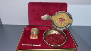 هاون برنجی با طراحی خاص: هاون برنجی با طراحی زیبا و مقاوم، برای آسیاب کردن زعفران و استخراج بهترین طعم و عطر آن.